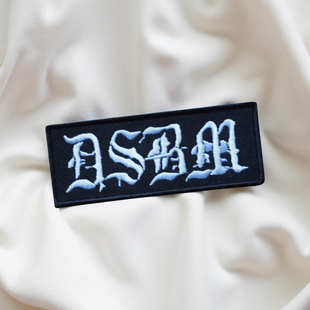 Design: “ASBM” in Gothic Old English typography with weathered, frostbitten effects