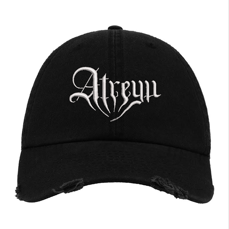 This black distressed baseball cap features a bold white embroidered patch design inspired by the Atreyu style logo. The image shows how the embroidery will look when stitched on the cap, giving you a realistic preview of its textured, high-quality finish. Made from durable cotton with a comfortable adjustable strap, this cap blends metalcore aesthetics with everyday streetwear style.