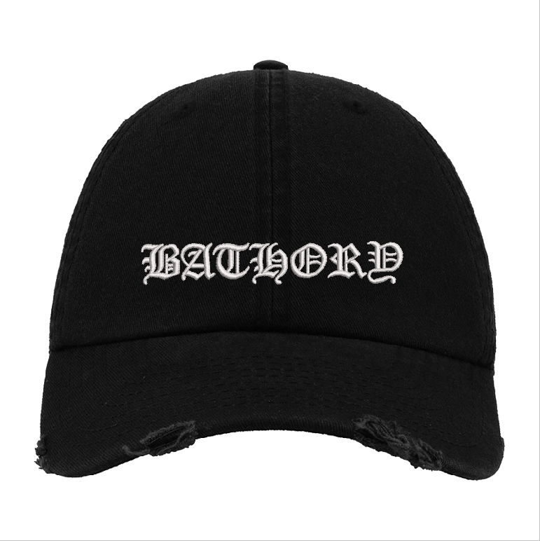 This black distressed baseball cap features a bold white embroidered patch design inspired by the Bathory style gothic lettering. The image shows how the embroidery will look when stitched on the cap, giving you a realistic preview of its textured, high-quality finish. Made from durable cotton with an adjustable strap, this cap delivers classic black metal aesthetics blended with modern streetwear appeal.