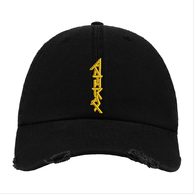 This black distressed baseball cap features a striking yellow embroidered patch design inspired by the classic Anthrax style logo, arranged vertically for a bold and unique look. The image shows how the embroidery will appear when stitched on the cap, giving you a realistic preview of the textured, high-quality finish. Crafted from durable cotton and equipped with an adjustable strap, this cap blends comfort, thrash-metal attitude, and rugged streetwear appeal.