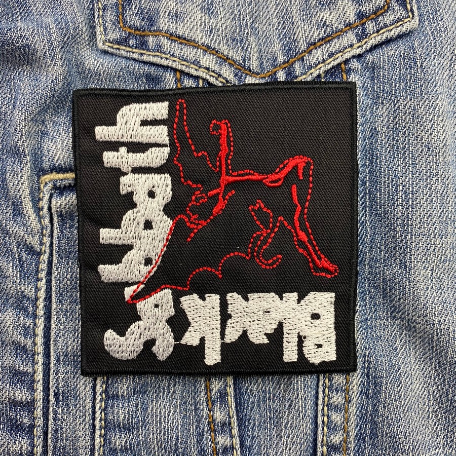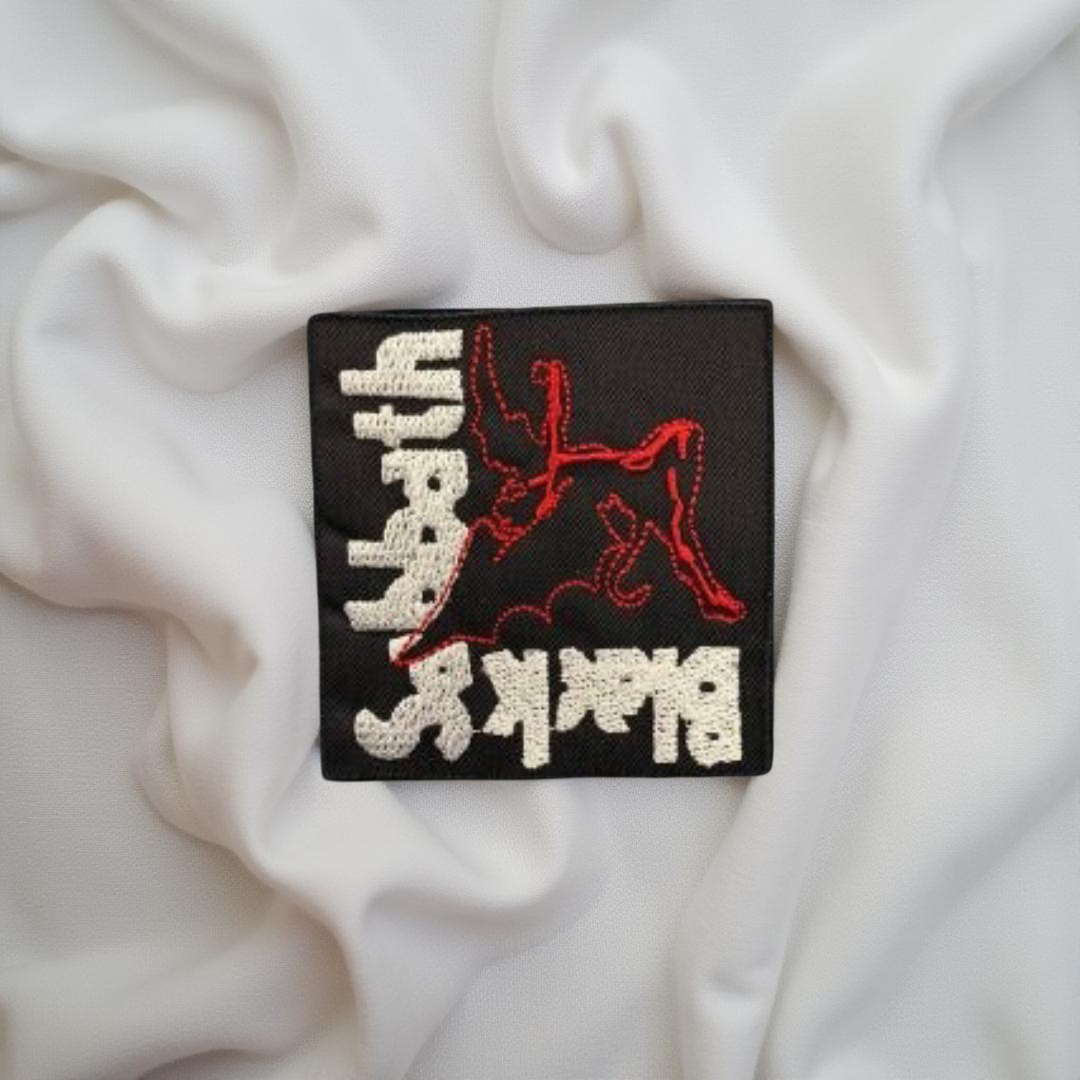 Design: Vertical rectangle patch with a red demon silhouette and stylized “BLACK SABBATH” text oriented around the figure.