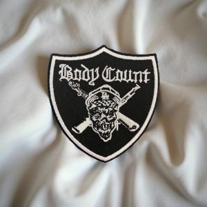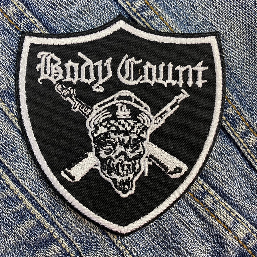 Design: Shield-style patch with “Body Count” gothic logo, skull wearing an LA cap, and crossed rifles