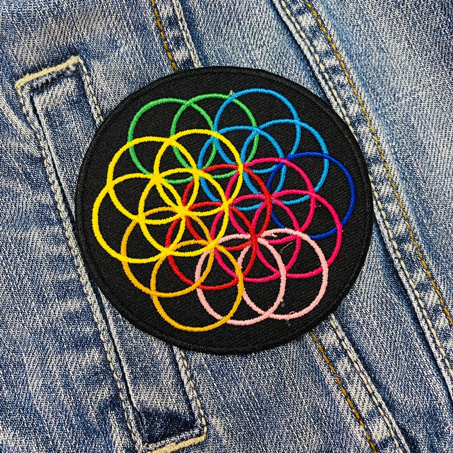 Celebrate the iconic A Head Full of Dreams era with this vibrant Coldplay Flower of Life Iron-On Patch. Featuring the symbolic multicolored geometric design from the album artwork, this patch brings a burst of energy and positivity to any garment. A perfect accessory for Coldplay fans and lovers of bold, psychedelic visuals.
