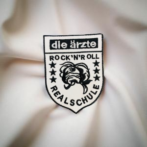 • Design: Shield-shaped patch with “die ärzte” logo, a stylized face graphic, and “Rock’n’Roll Realschule” text surrounded by stars
