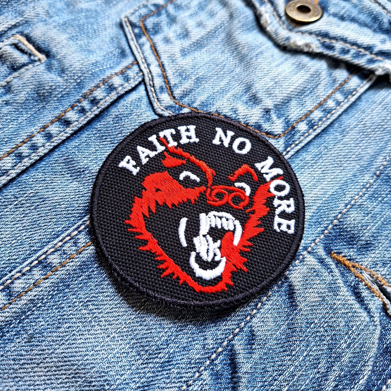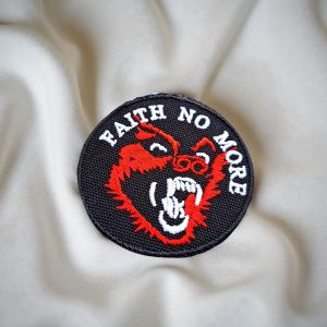 Design: Round patch with a snarling red beast face and “FAITH NO MORE” arched above.