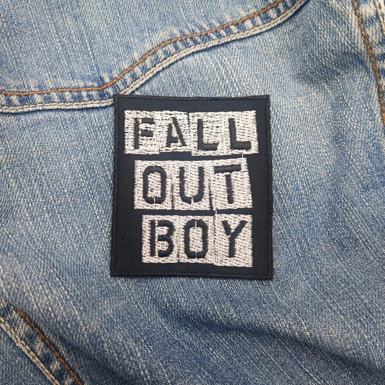 Design: Block-style lettering spelling “FALL OUT BOY” in a bold, three-line stacked layout on a black background with white stitched blocks and black letters.