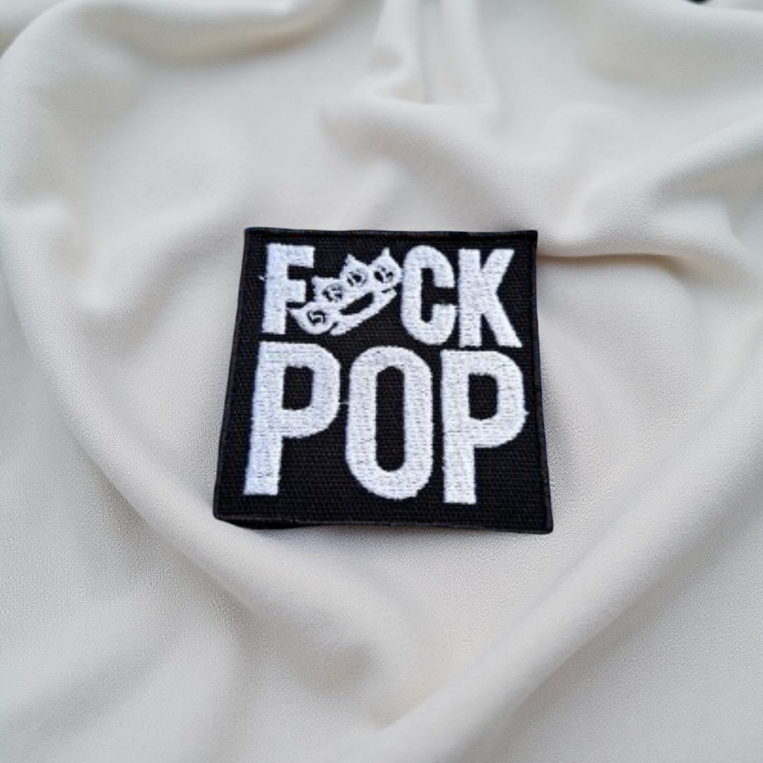 Design: Bold block lettering with the phrase “F*CK POP”, with a brass knuckle graphic substituting the “U”.