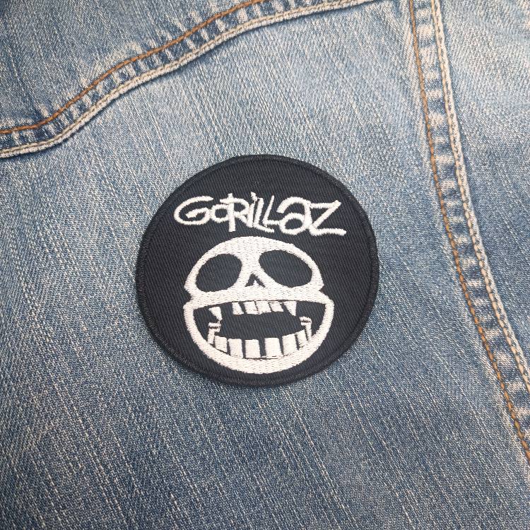 Design: Circular patch with the Gorillaz band name in stylized graffiti lettering above a cartoon skull face, embroidered in bold white on black..
