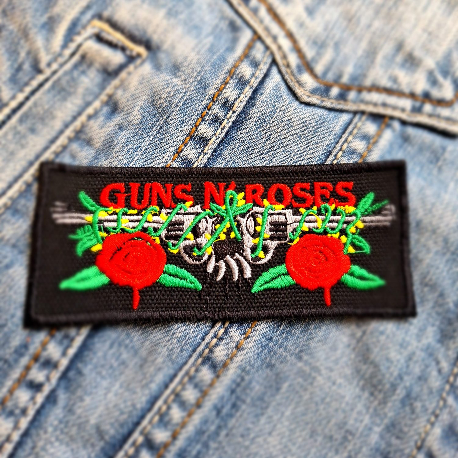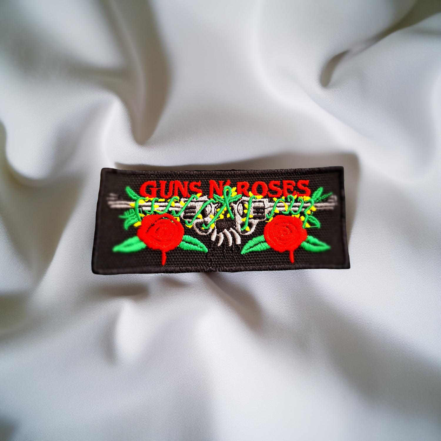 Design: Guns N’ Roses text with barbed wire, two roses, green leaves, and thorn vines.