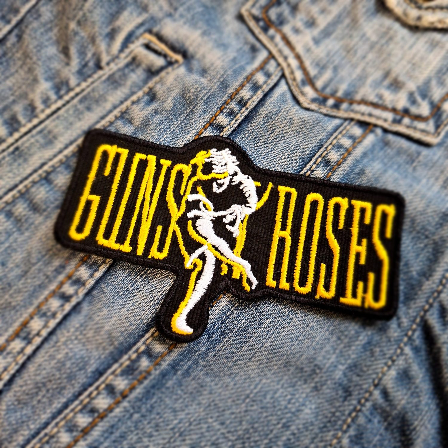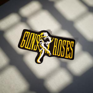 Design: Dancing skeleton wrapped in a scarf positioned between elongated “GUNS” and “ROSES” text.
