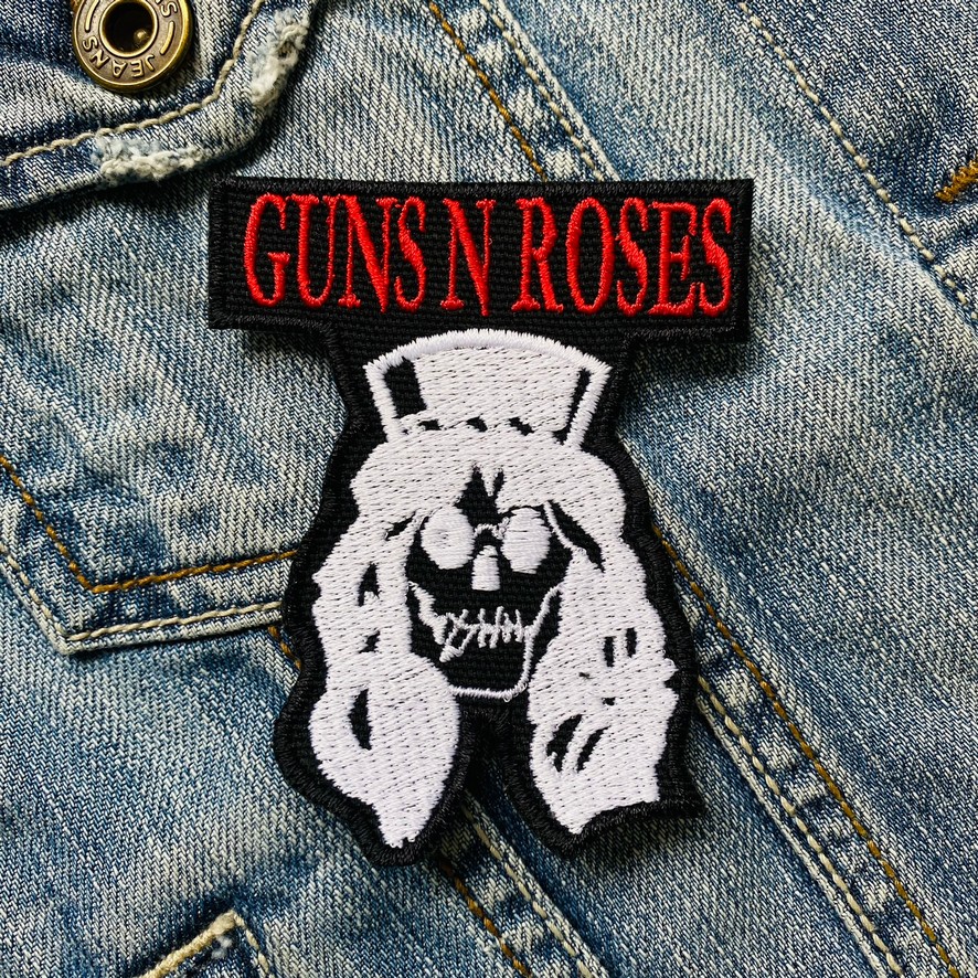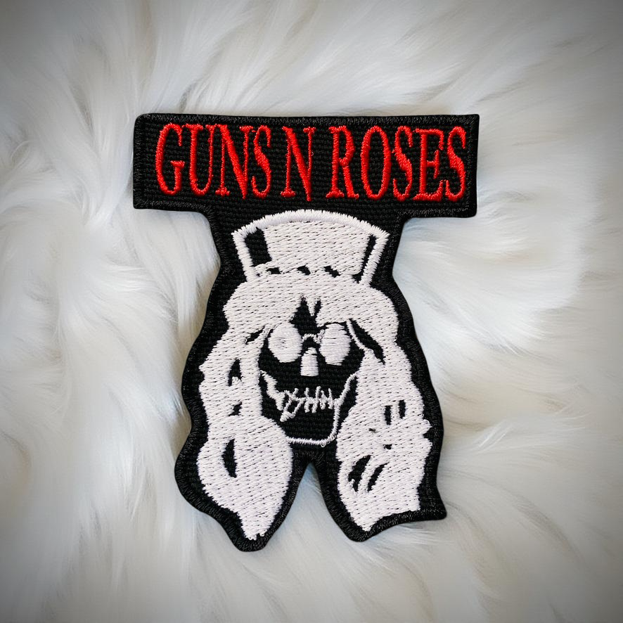 Design: Skull with long hair and top hat, inspired by Guns N’ Roses band aesthetics, with bold red “GUNS N’ ROSES” text.