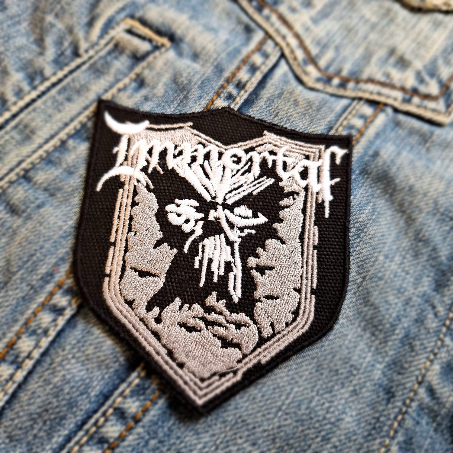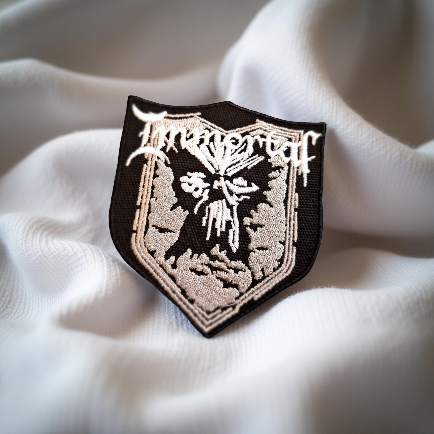 Design: Shield-shaped patch with Immortal band logo and grim figure centerpiece