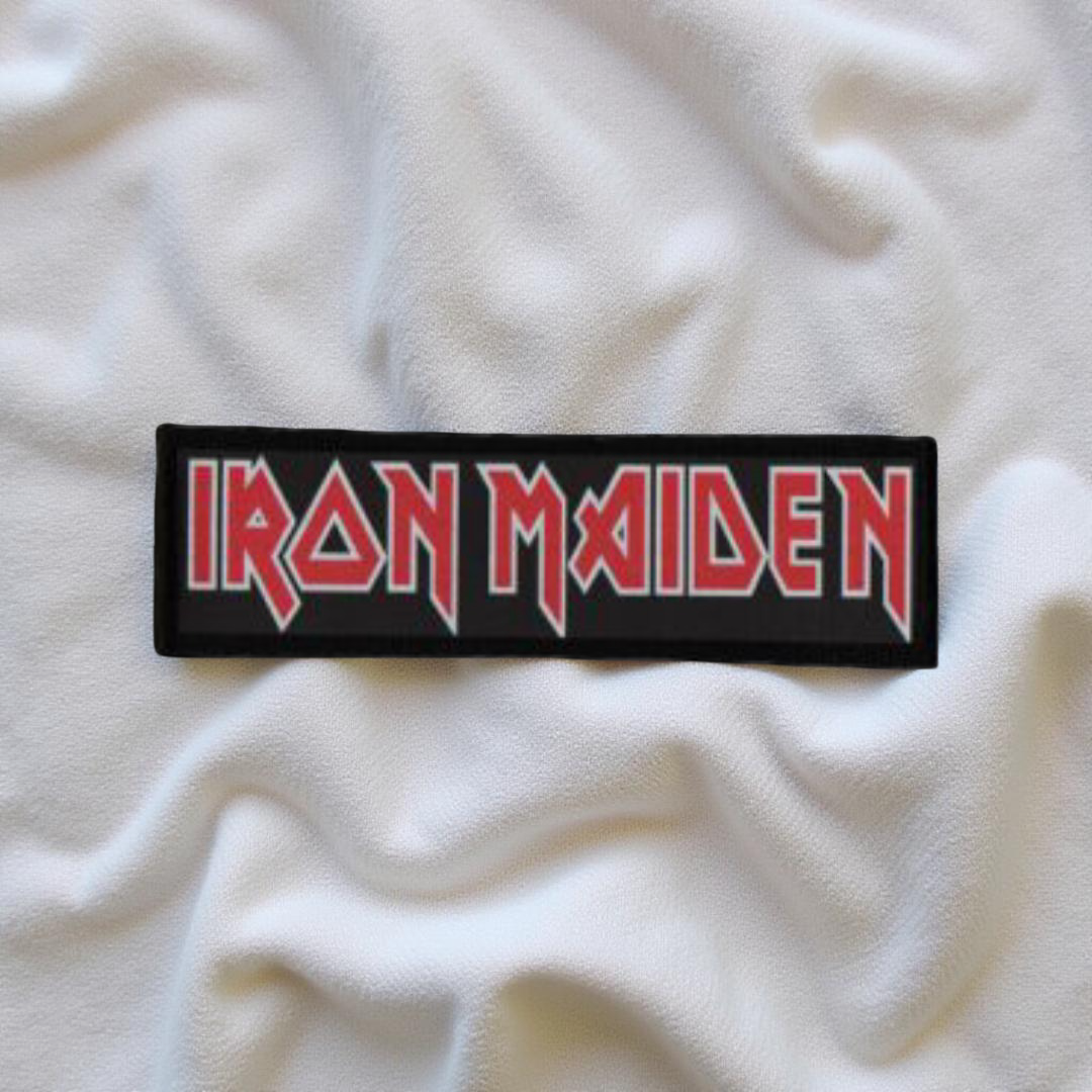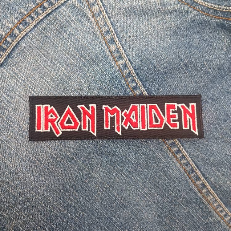 Design: Classic “IRON MAIDEN” band logo in sharp, angular font across a long rectangular strip.