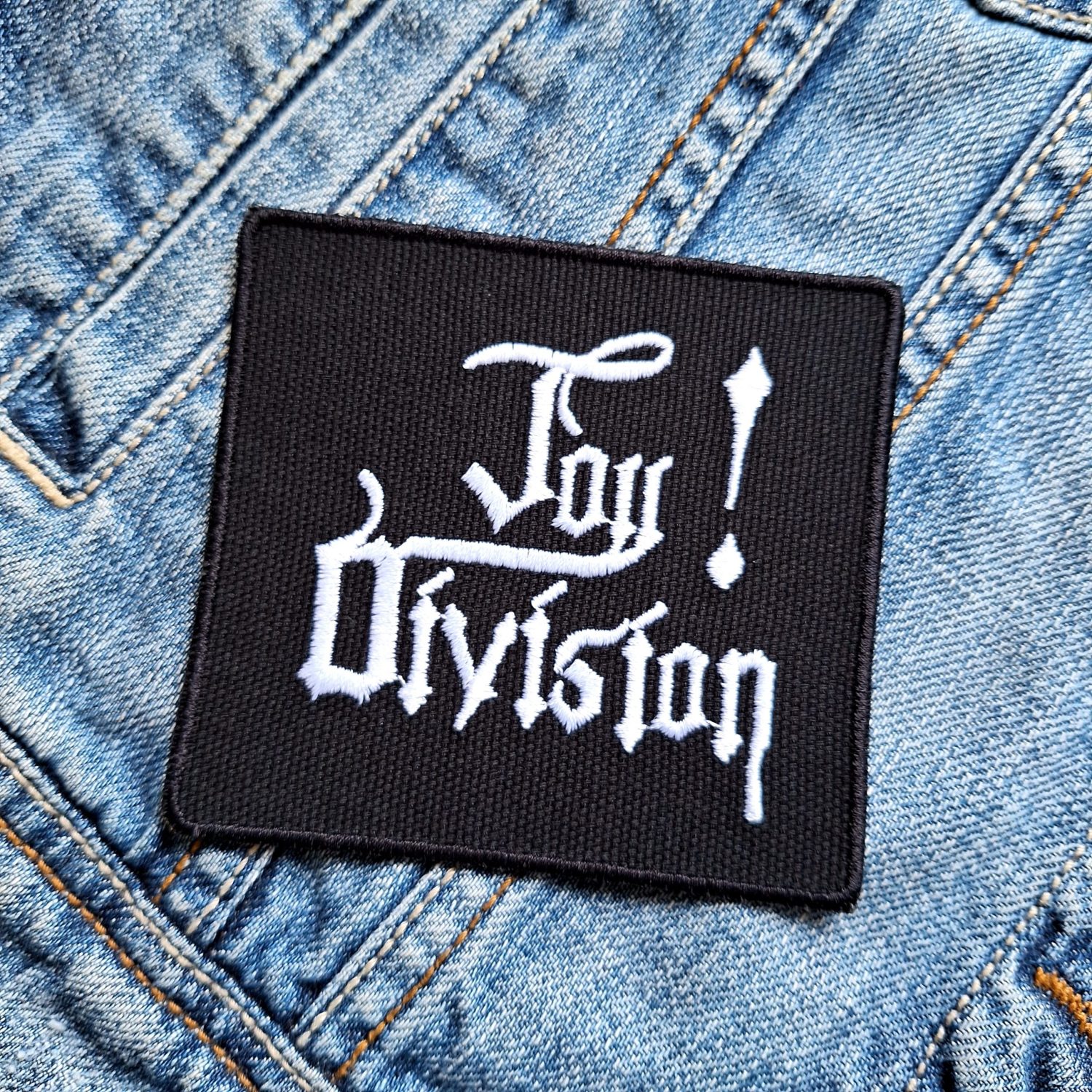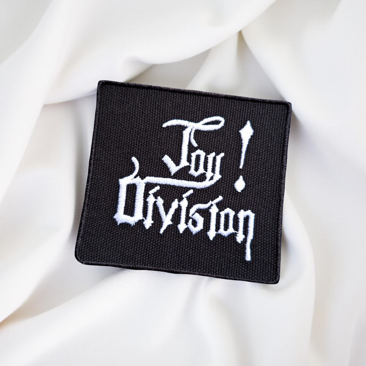 Design: Gothic-style “Joy Division” text with a dramatic exclamation point