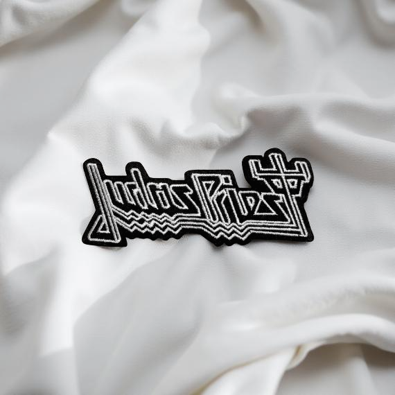 Design: Classic Judas Priest logo in a zigzag, angular style with a black background and white stitching.