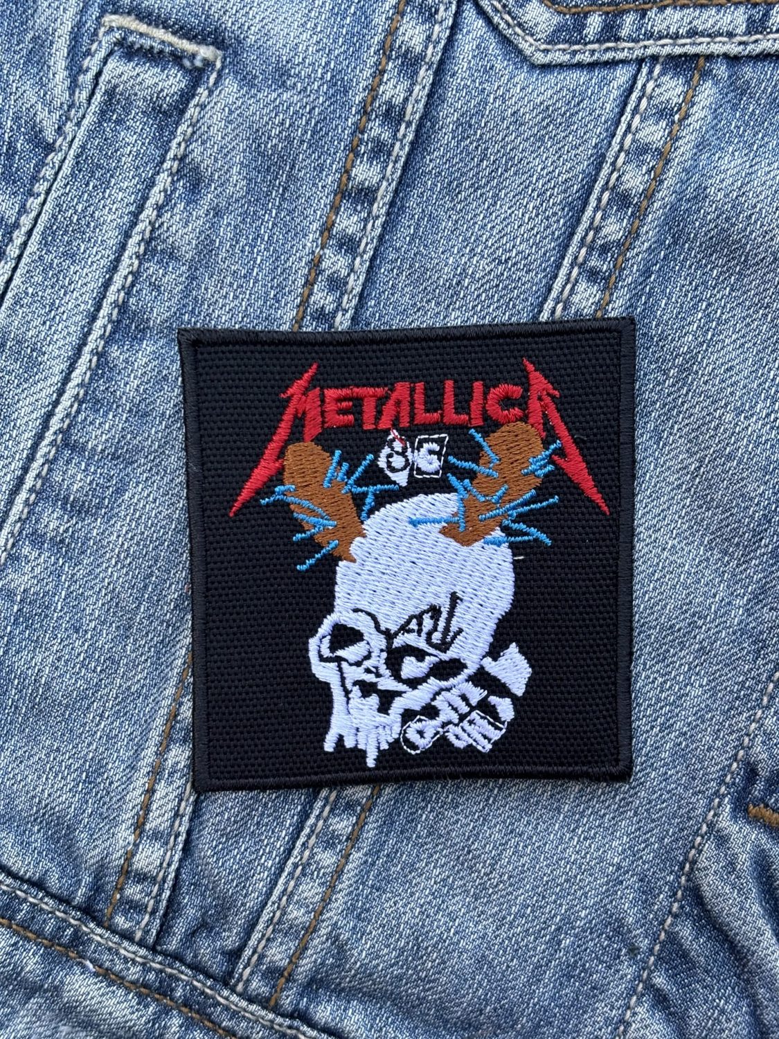 • Colors: Black background, white skull, red Metallica logo, blue lightning bolts, brown spiked maces