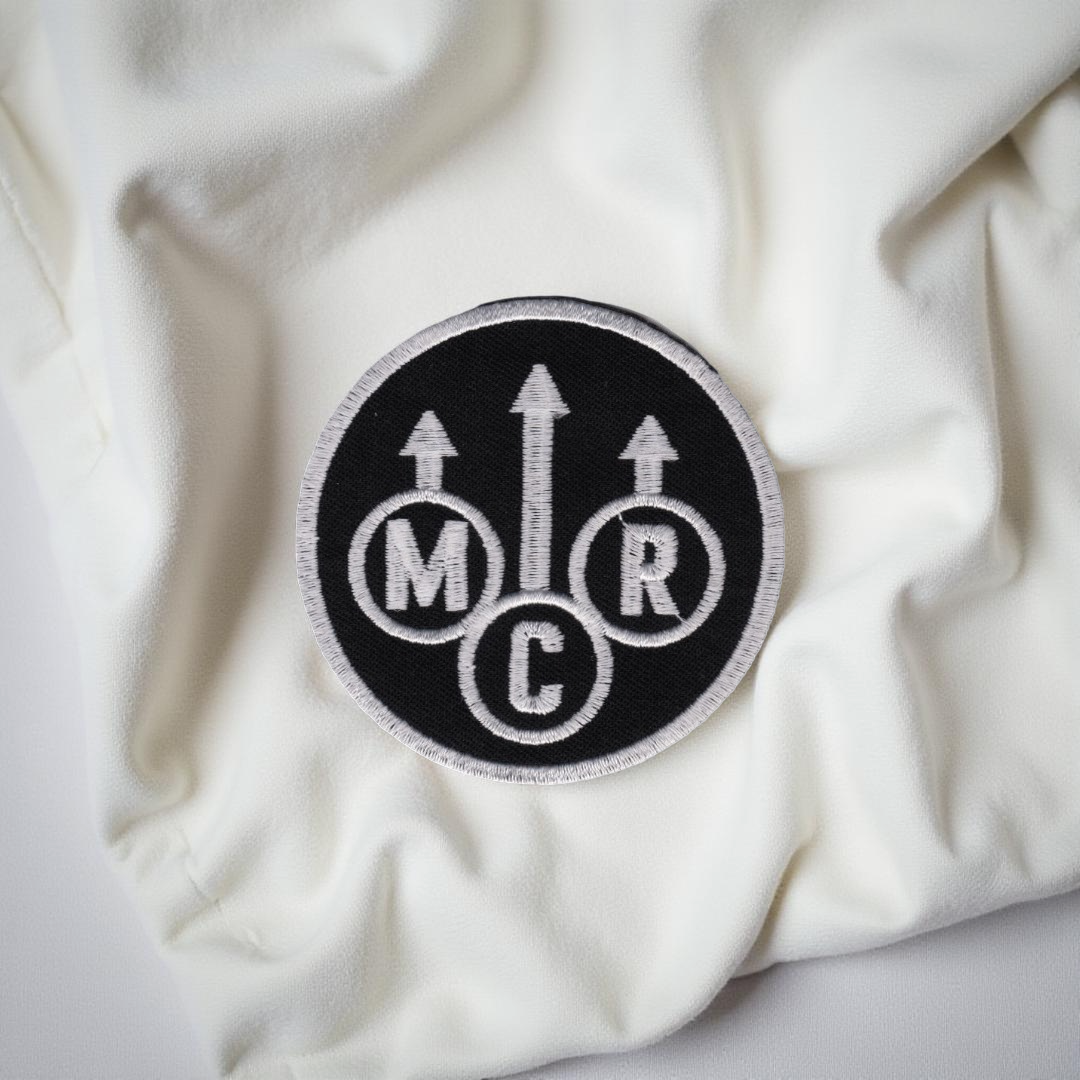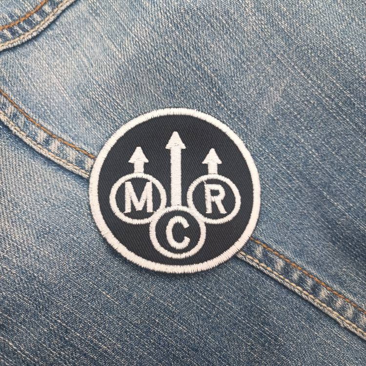 Design: Circular patch with three upward arrows and MCR initials in a geometric layout