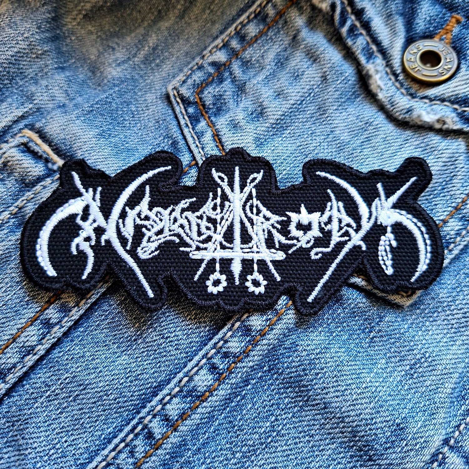 Design: White embroidered Nargaroth logo with detailed arc shapes and sigil accents in a jagged border finish