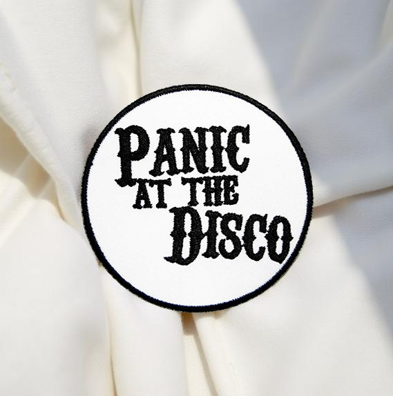 Design: Black “Panic At The Disco” gothic-style font on crisp white background with black trim.