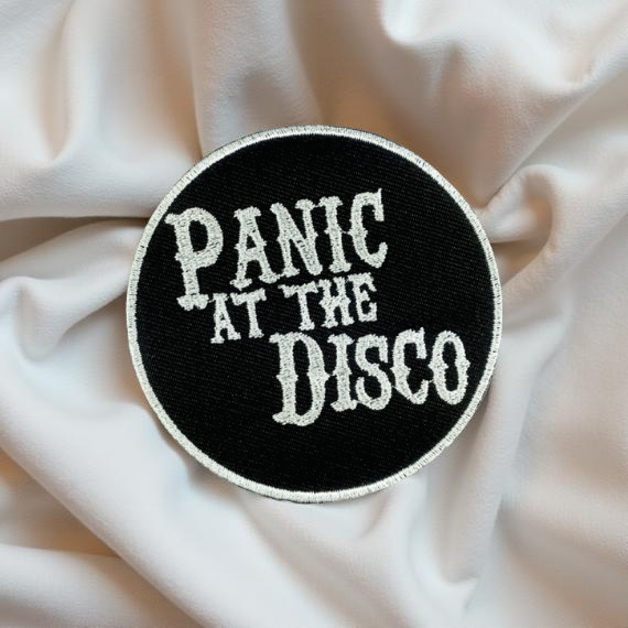 Design: White “Panic At The Disco” Gothic-style font on black background with white border.