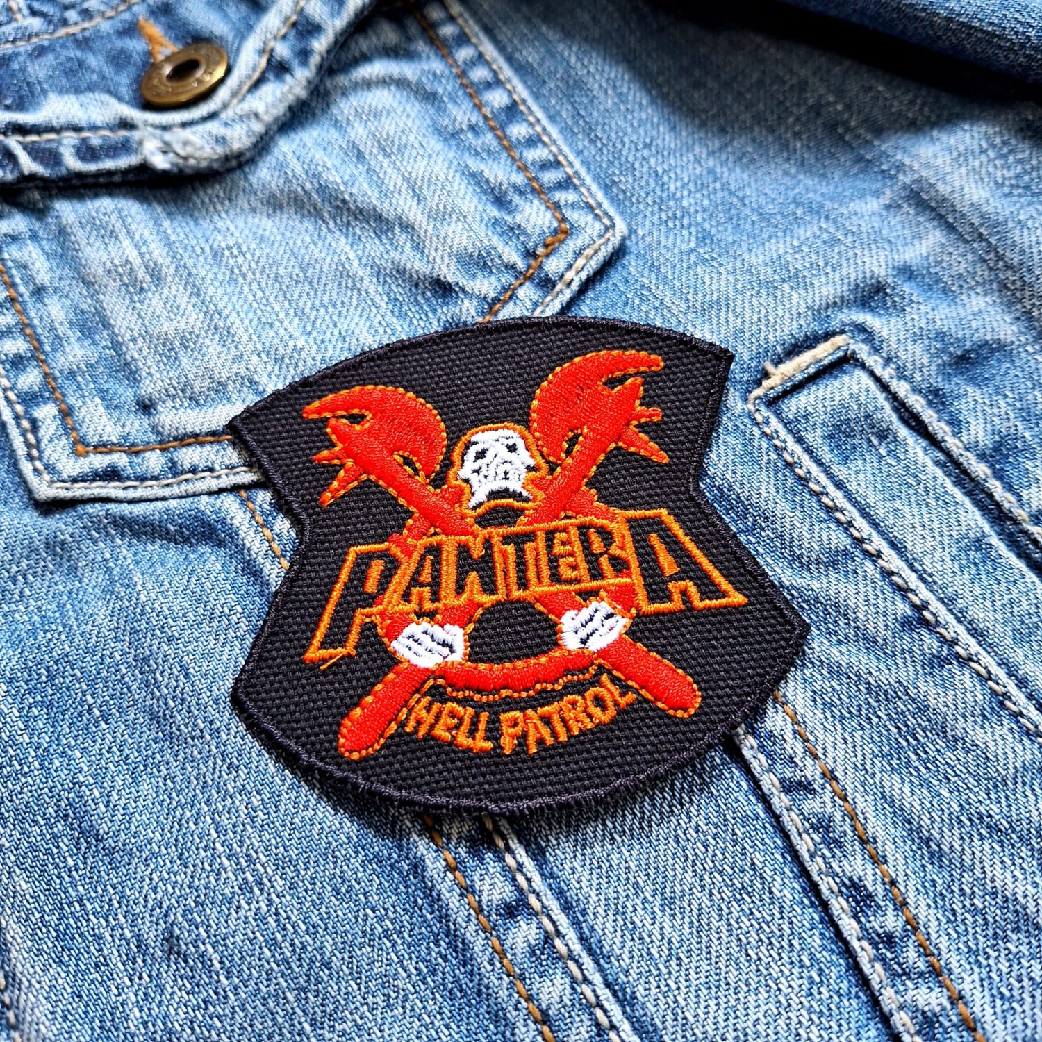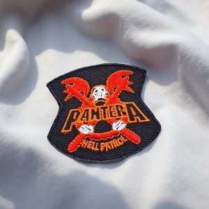 Design: Badge-shaped patch with skull and flaming crossed axes, “Pantera” and “Hell Patrol” lettering