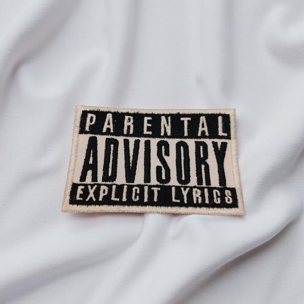 Design: Rectangular patch featuring the iconic “Parental Advisory Explicit Lyrics” warning label