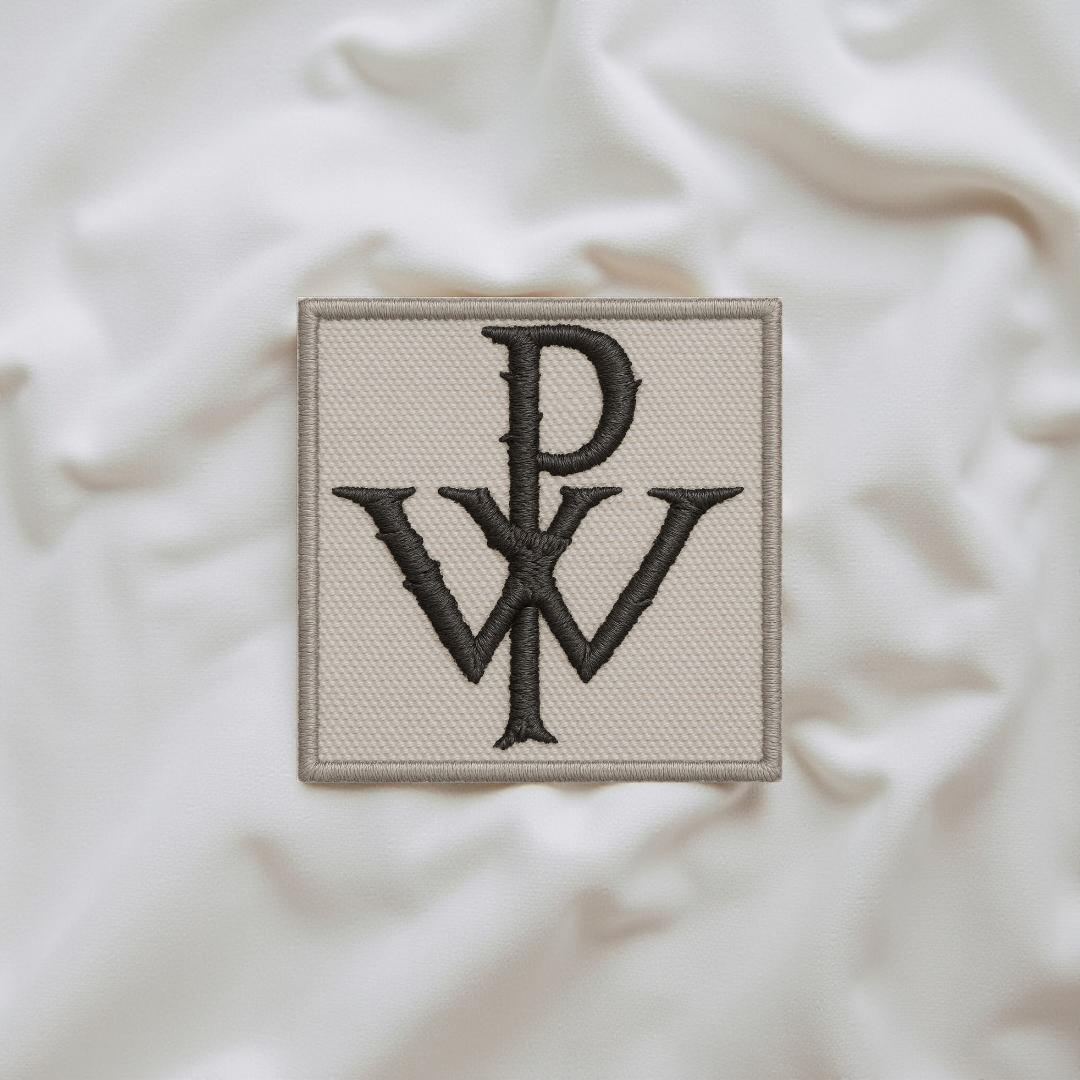 Design: Intertwined “P” and “W” monogram in gothic thorned style, surrounded by a stitched rectangular border