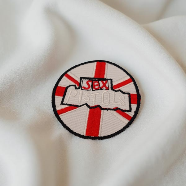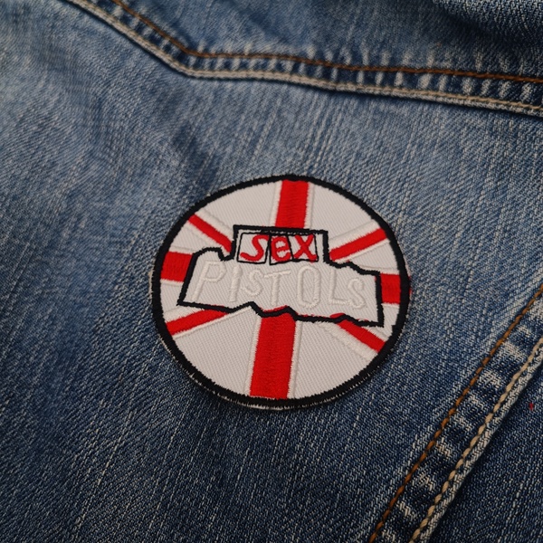 Design: Round patch with “Sex Pistols” logo over a stylized Union Jack