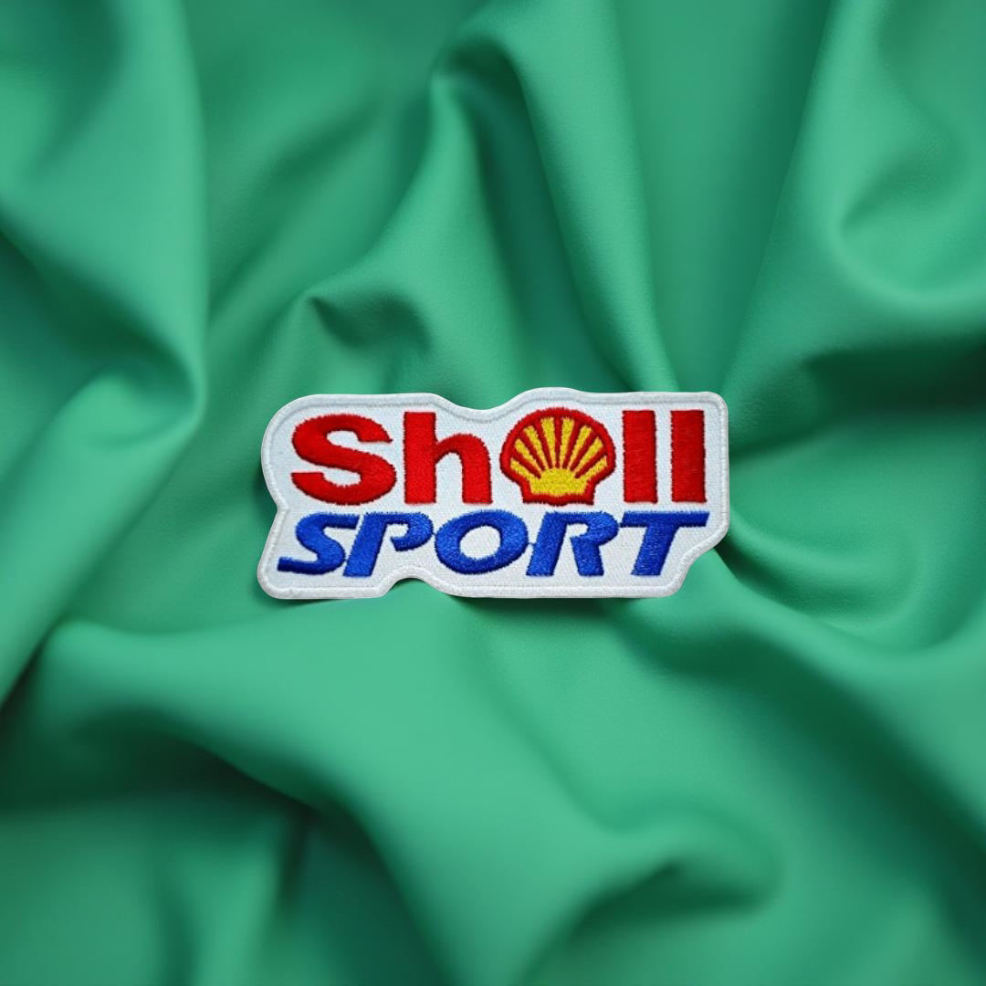 Design: Bold embroidered “Shell SPORT” logo with the classic Shell emblem as the “e” in “Shell”, all set in a unified white outline shape.