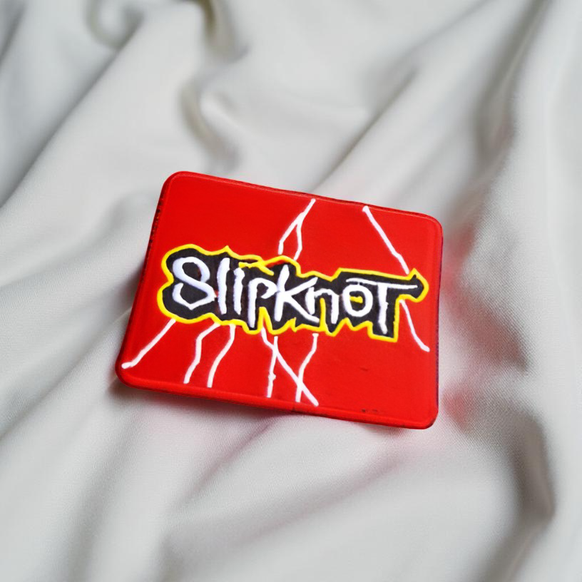 Design: Slipknot stylized logo in white outlined with black and yellow over a vivid red background with white lightning streaks