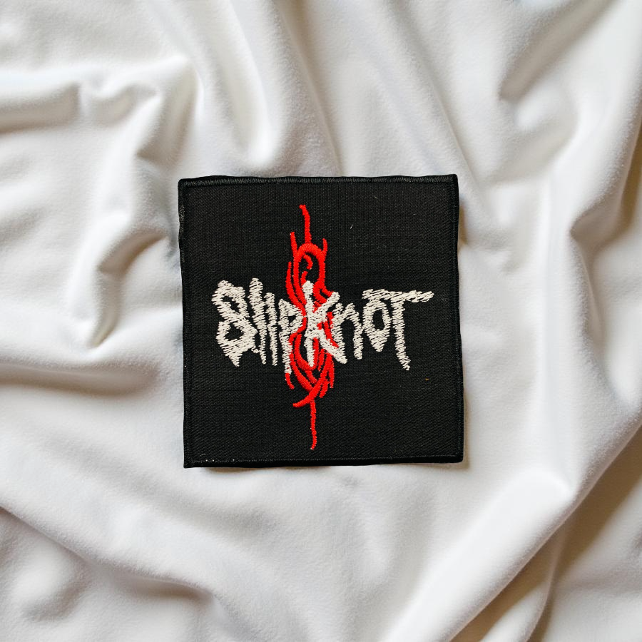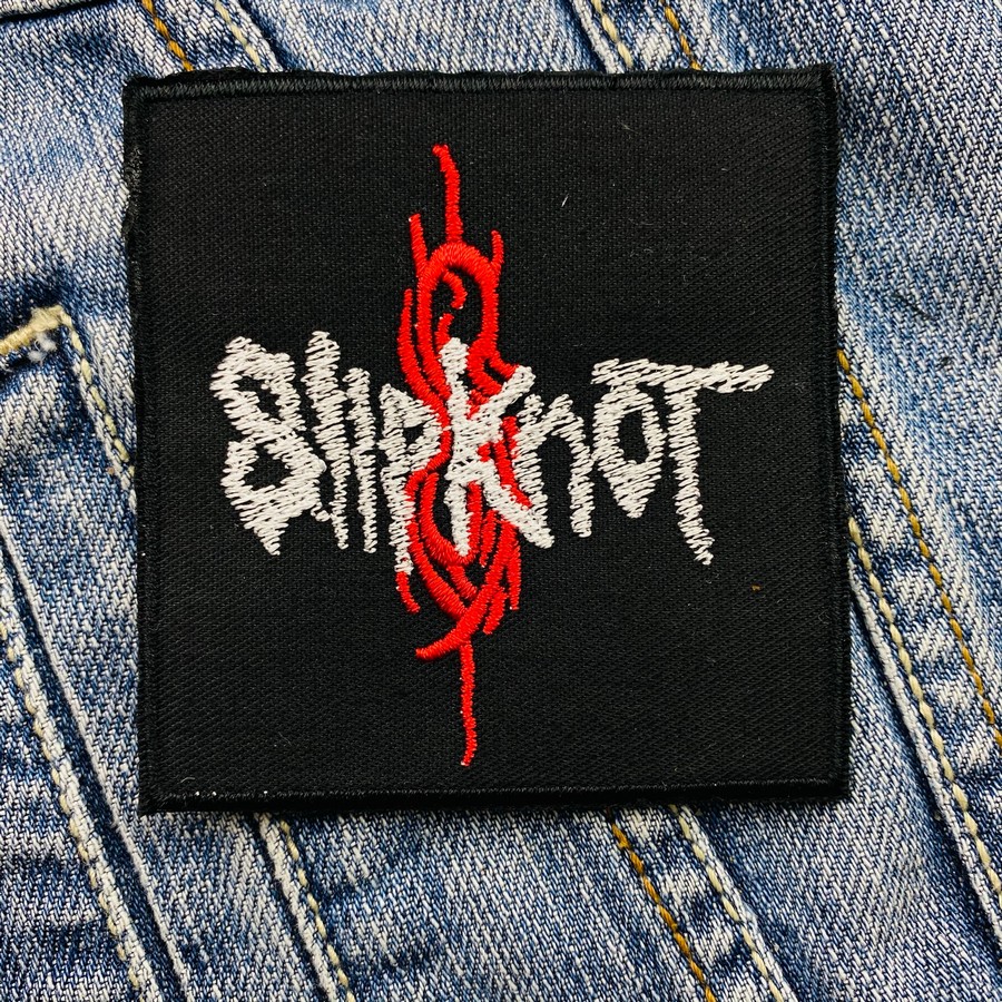 Design: White Slipknot band logo with vertical red tribal “S” symbol on a black square background