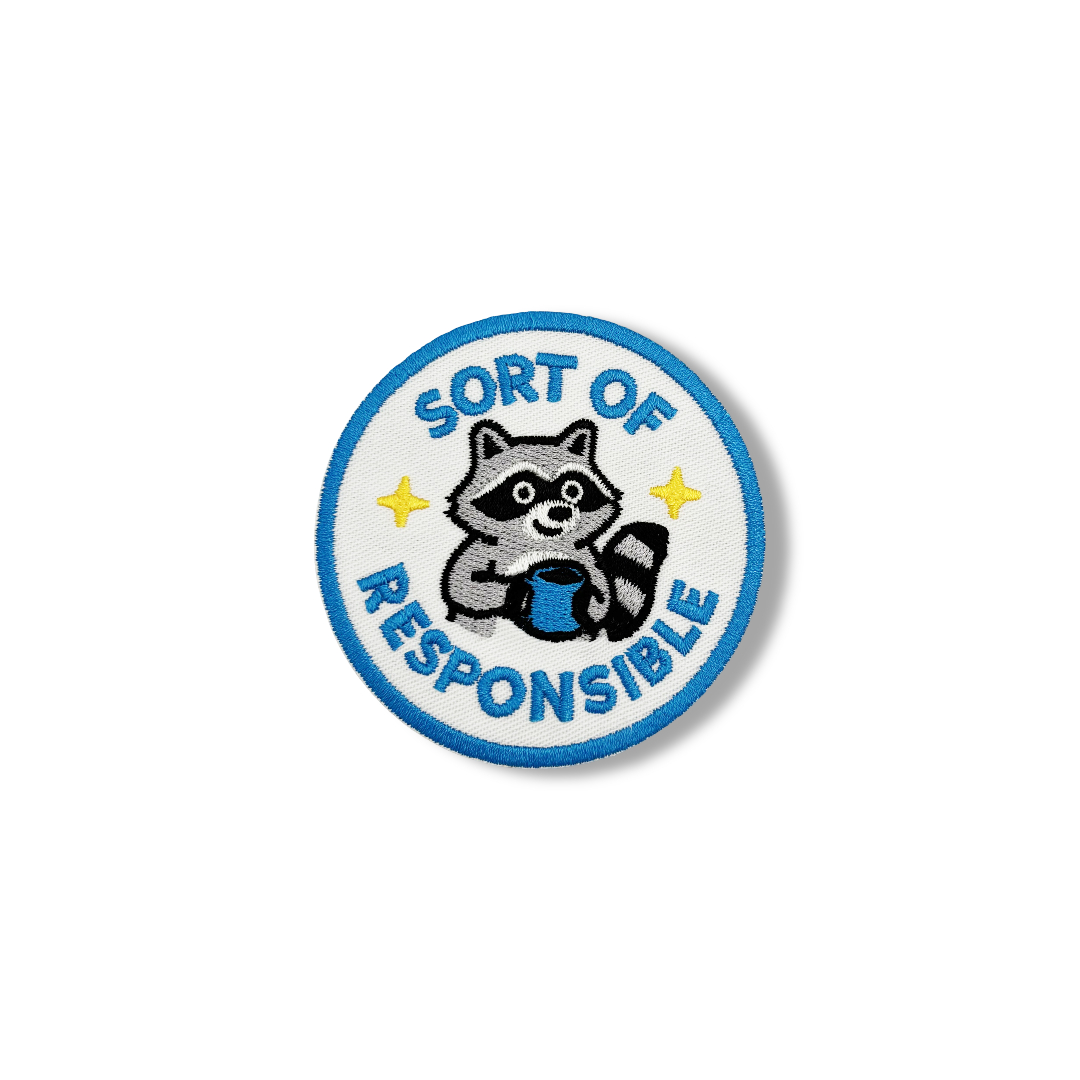 -30%Responsibility is a spectrum—and this “Sort of Responsible” embroidered patch lands comfortably in the middle. Featuring an adorable raccoon holding a cup and doing their best, this design is perfect for anyone who’s trying… most of the time.