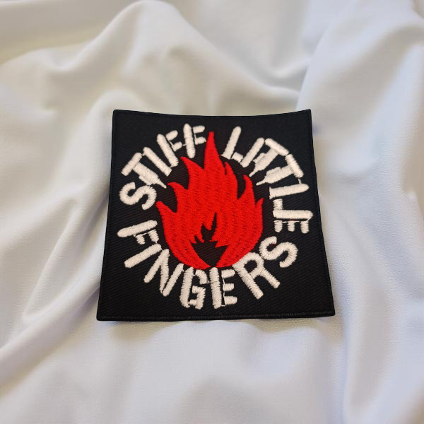 Design: Bold red flame with “Stiff Little Fingers” wrapped around it