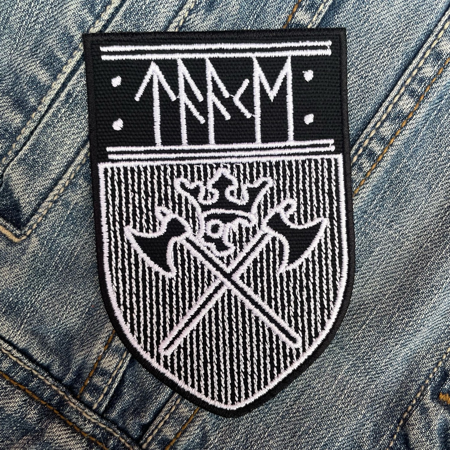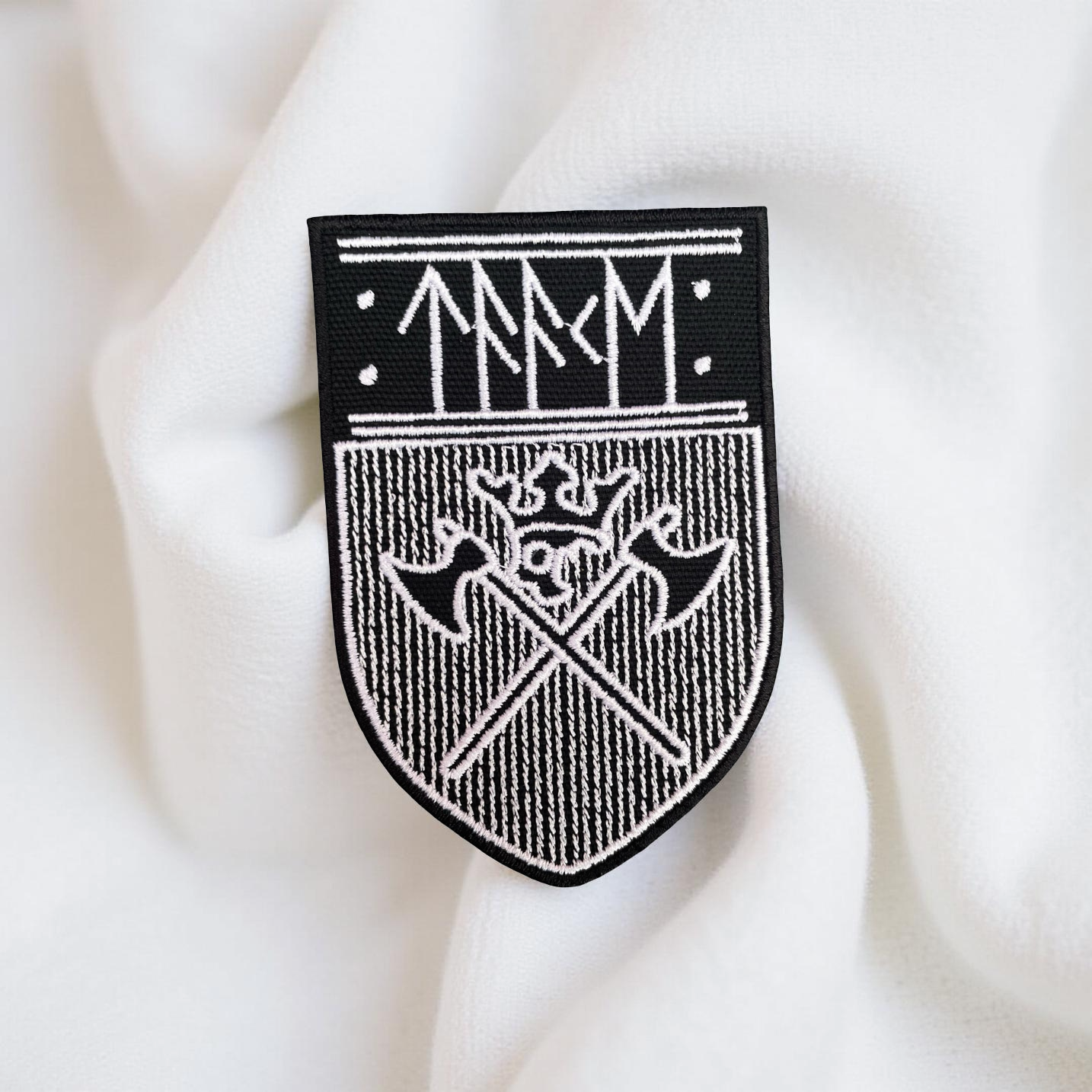 Design: Medieval-style shield with runes, a crowned skull, and crossed axes