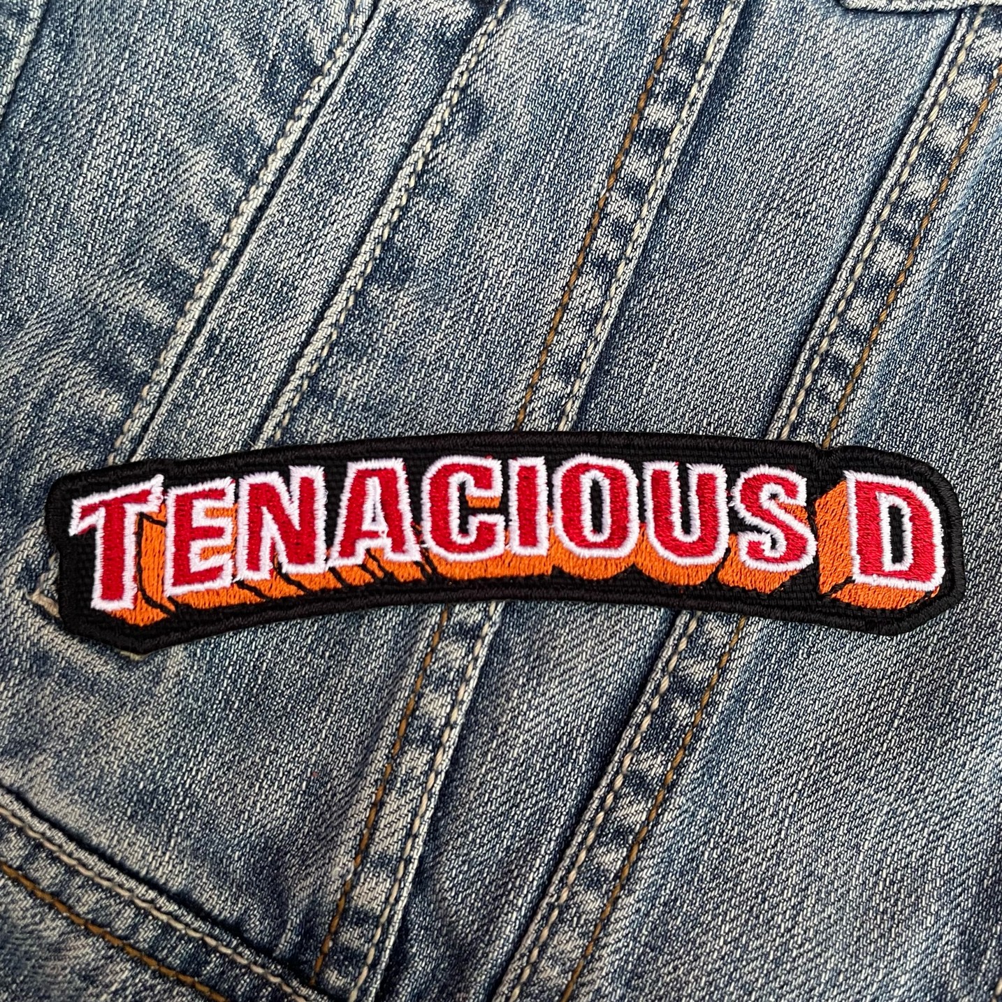 Design: Arched 3D block-letter “TENACIOUS D” logo with shadow detailing.
