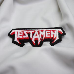 Design: Testament’s official stylized band logo in an angular cut shape.