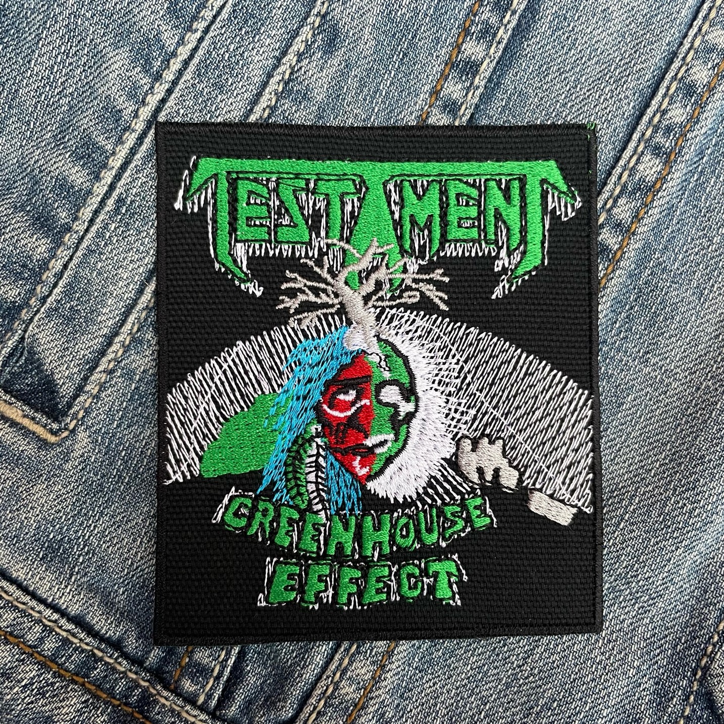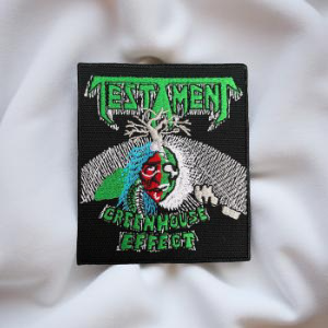 Design: Detailed scene with a split-face, barren tree, and environmental motifs, paired with Testament’s classic logo and “Greenhouse Effect” title.