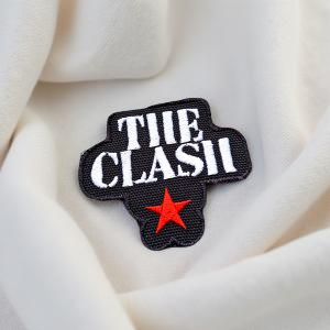 Design: Block-style “THE CLASH” lettering in white with a centered red five-point star underneath, all set against a black background with an irregular outline.