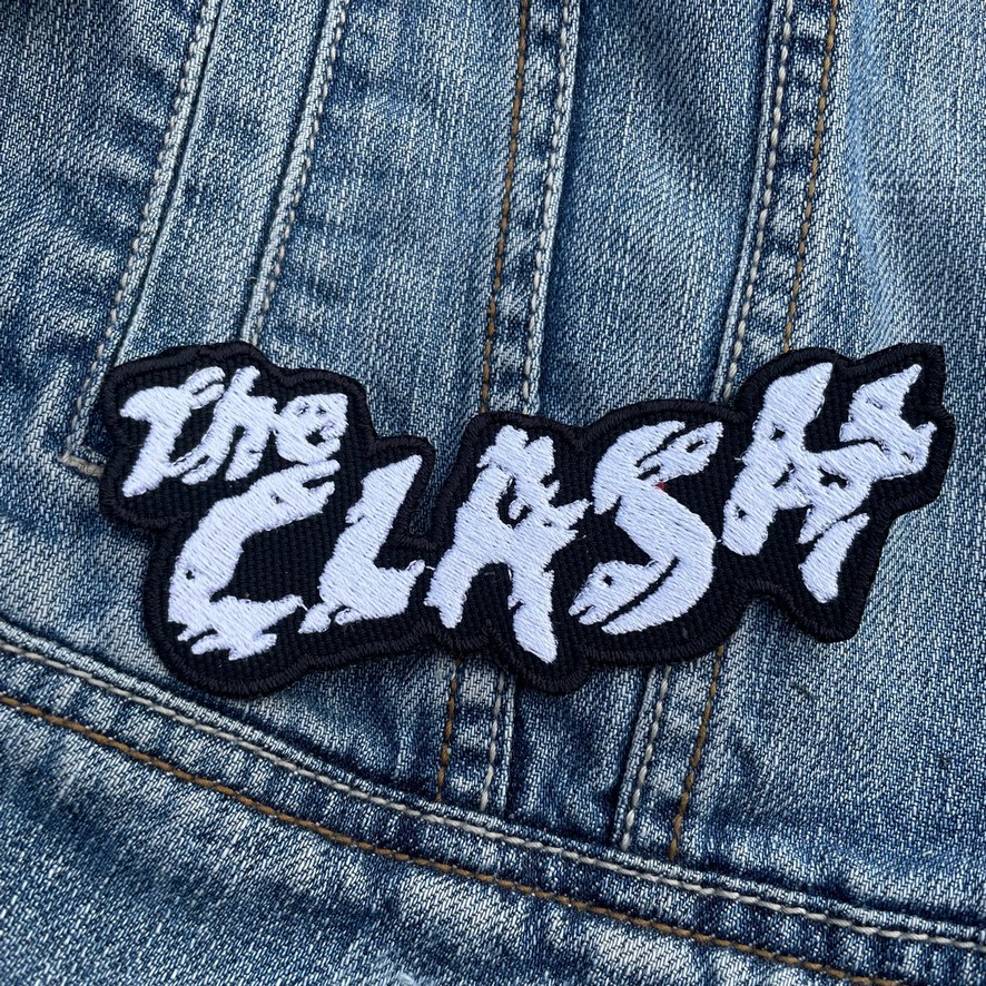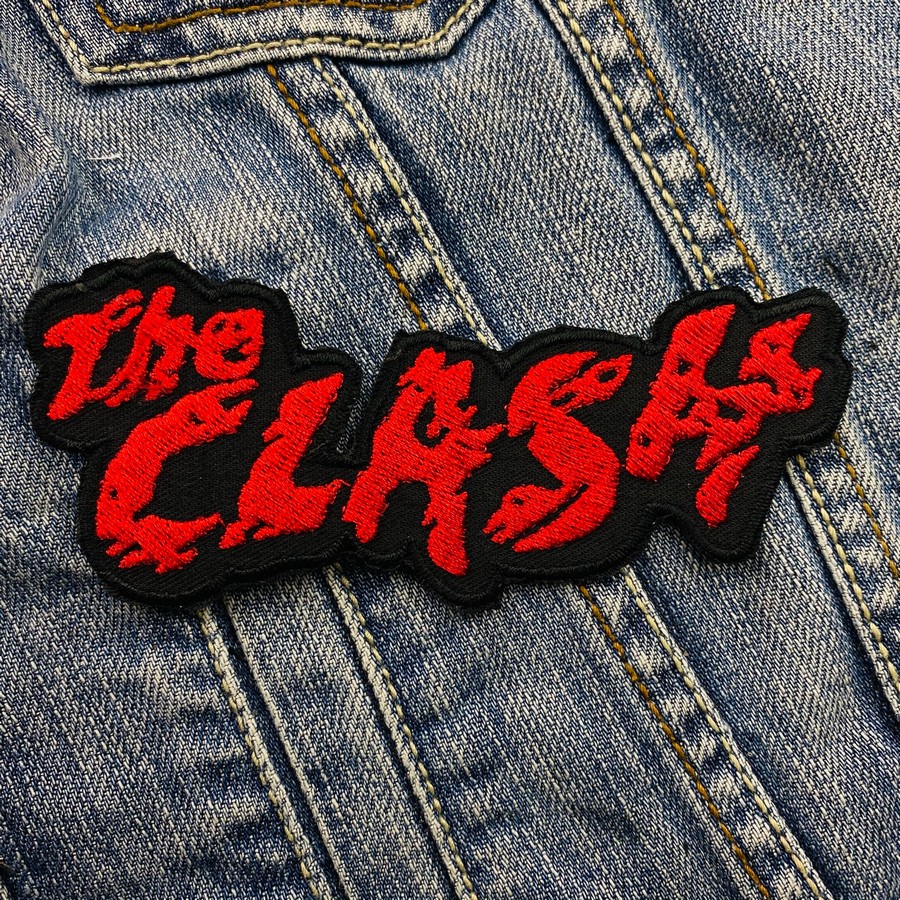 Design: The Clash logo in distressed, graffiti-style red font on a black fabric cutout.