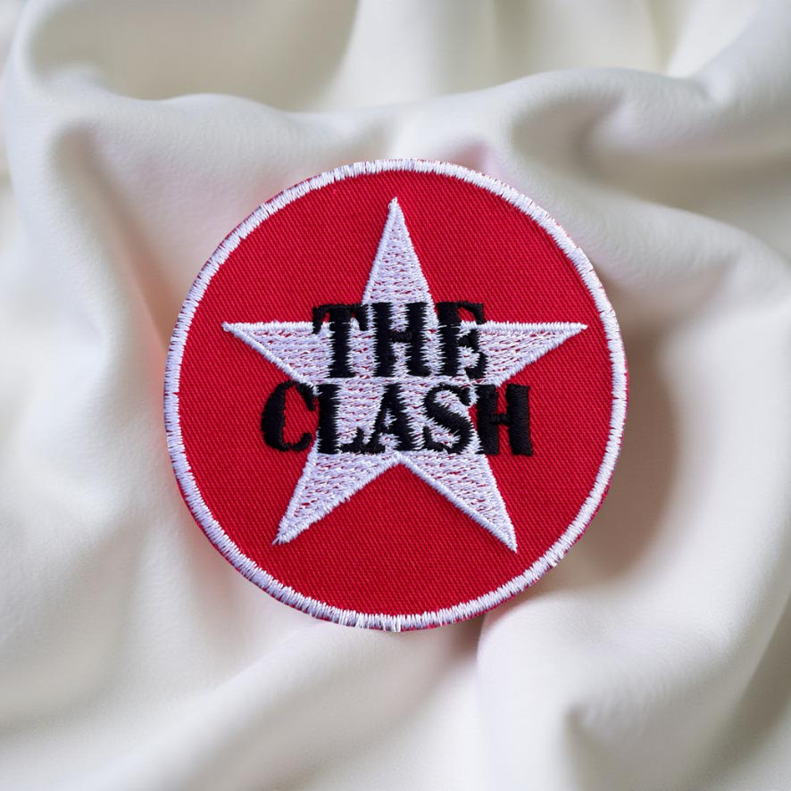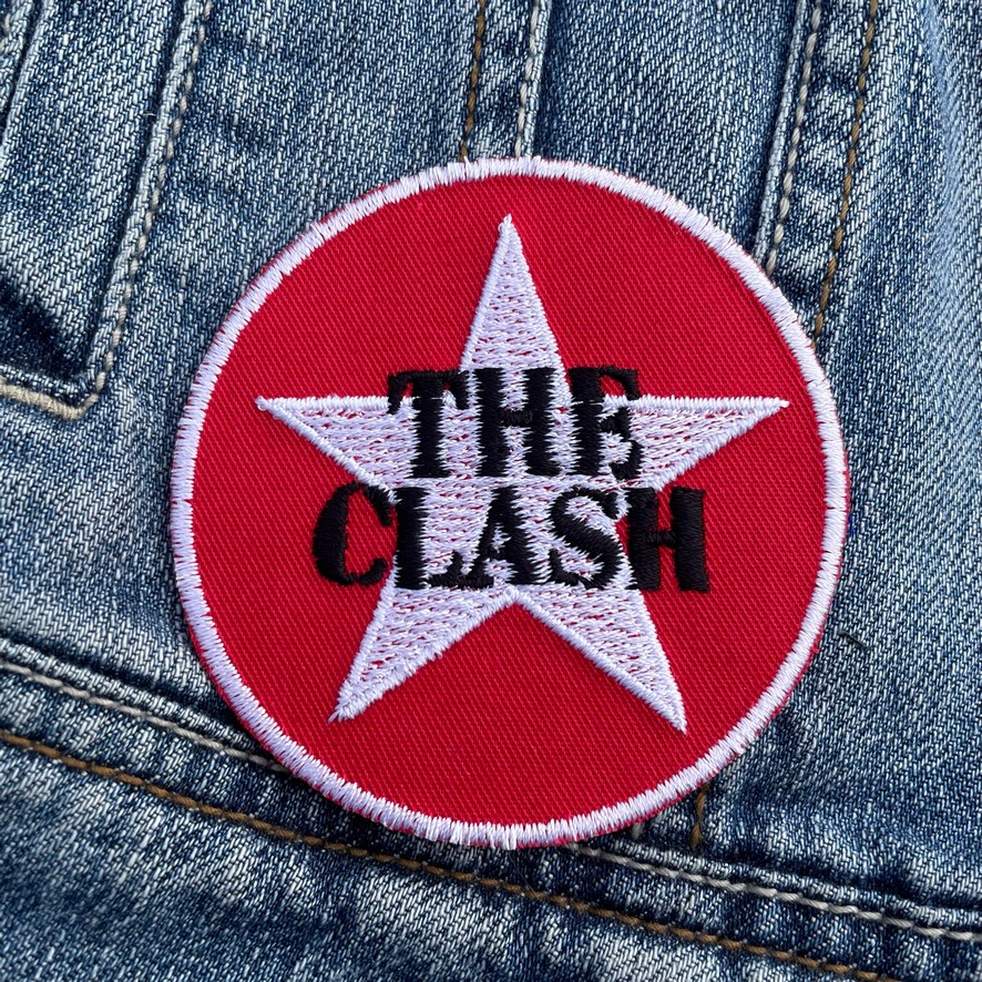 Design: Circular red background with a large white embroidered star and bold black “The Clash” text overlay.