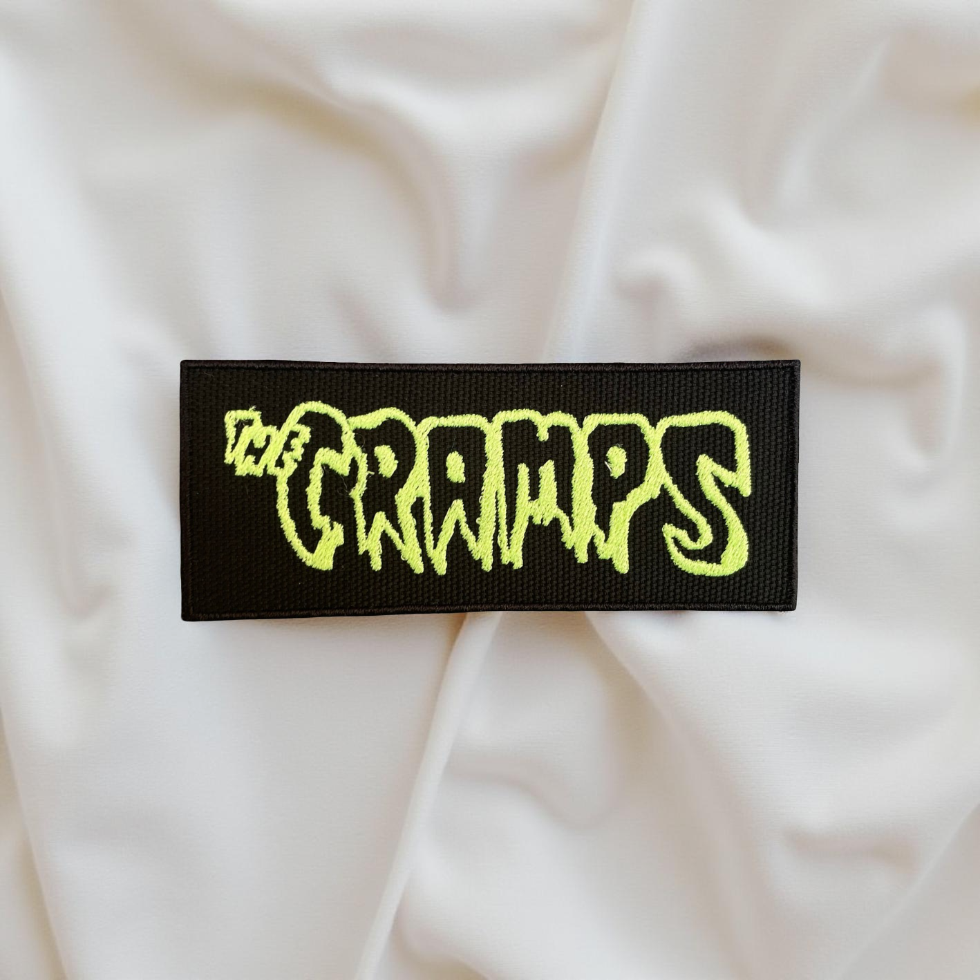 Colors of Design: Black background with neon green embroidered text.