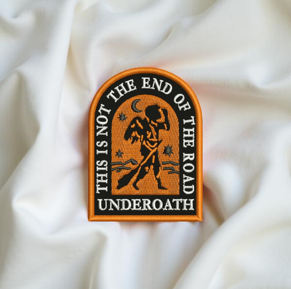 Design: Angel silhouette walking with a staff under a crescent moon and stars, surrounded by the words “THIS IS NOT THE END OF THE ROAD” and “UNDEROATH”