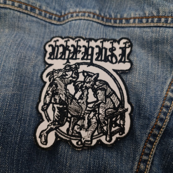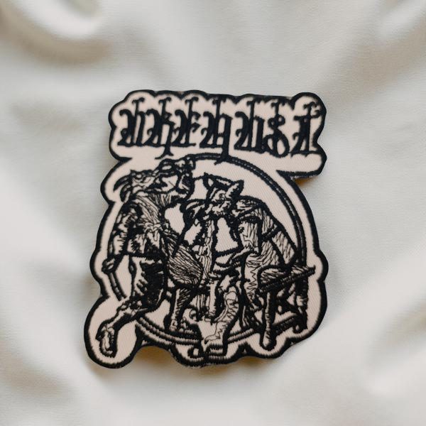 Design: Gothic logo over a detailed illustration of three humanoid goats in a circular emblem