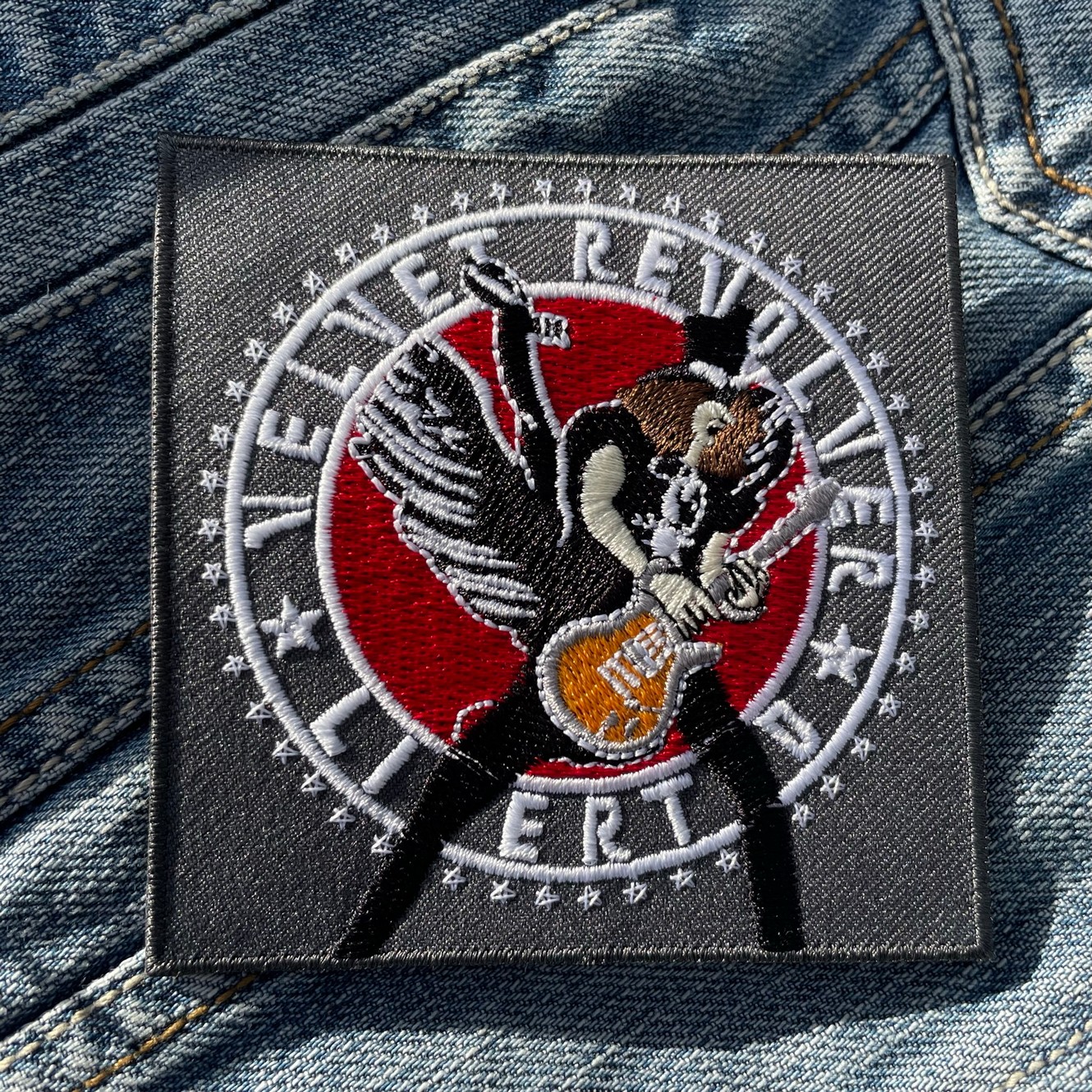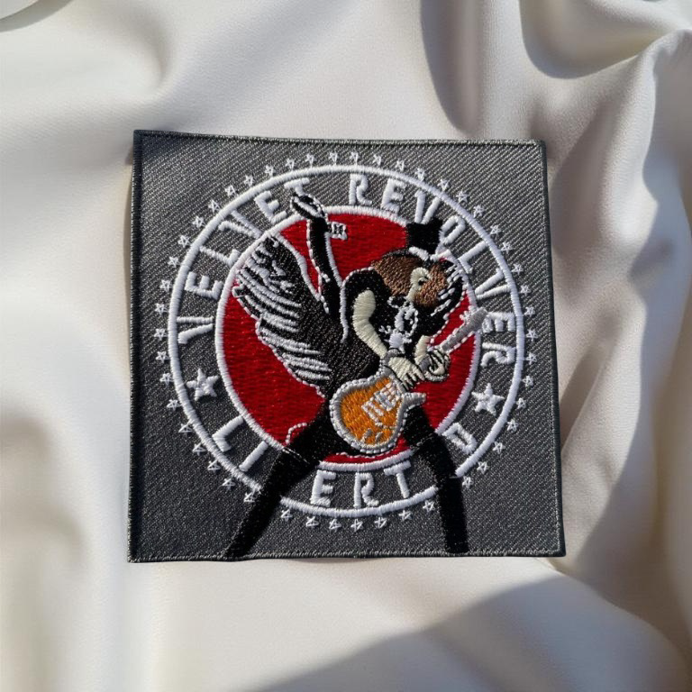 Design: Winged woman playing electric guitar surrounded by the circular “VELVET REVOLVER LIBERTAD” emblem