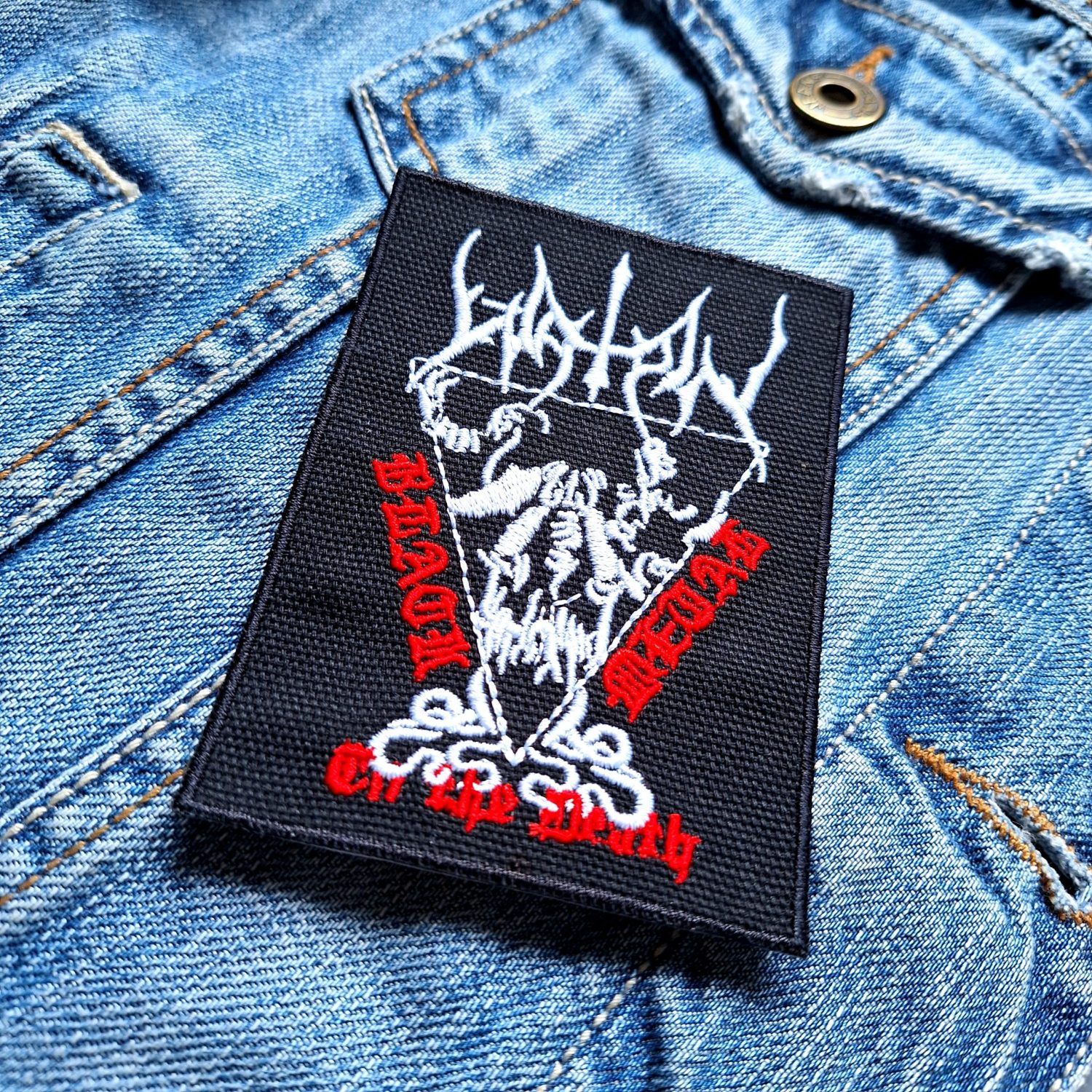 Design: Rectangular patch with skeletal demon illustration, Watain logo, and red gothic text