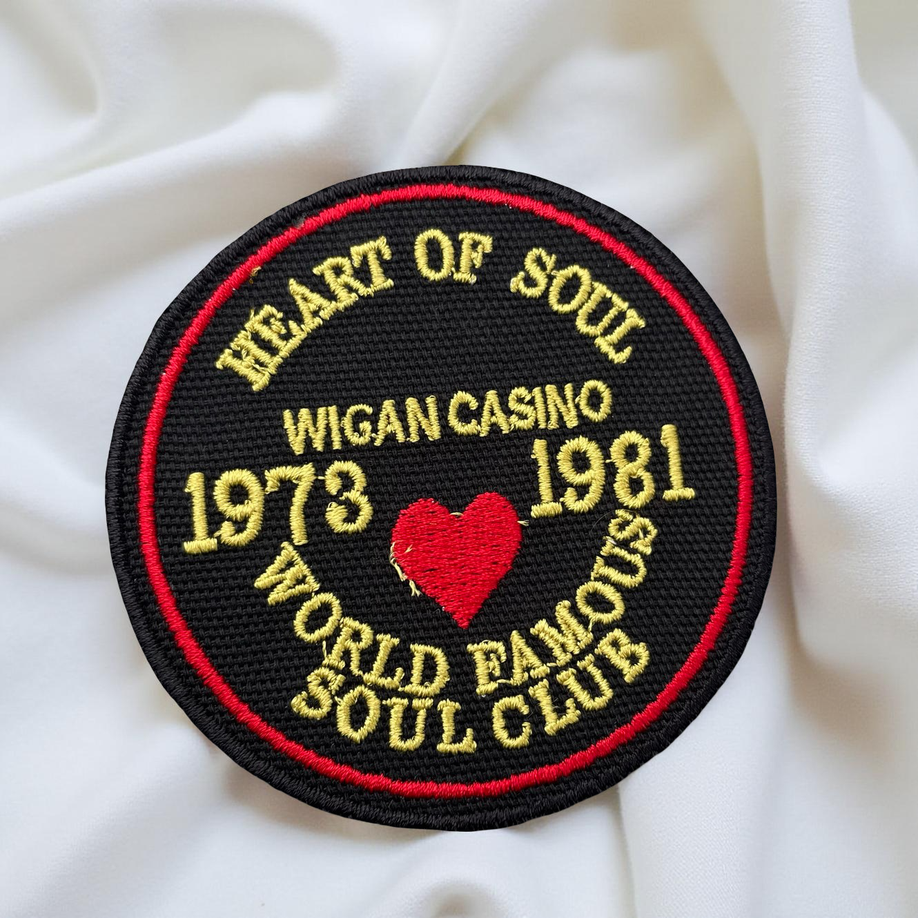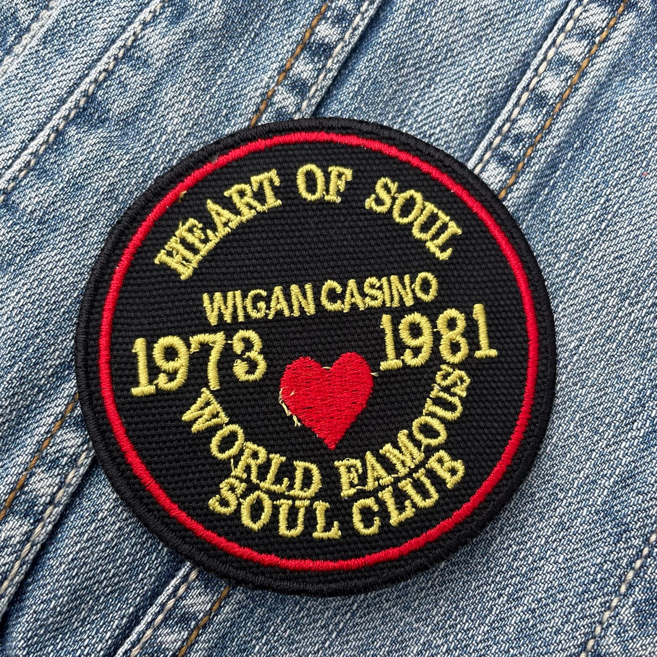 Celebrate the golden era of soul with this classic “Heart of Soul” Wigan Casino patch—perfect for fans and collectors of Northern Soul culture.