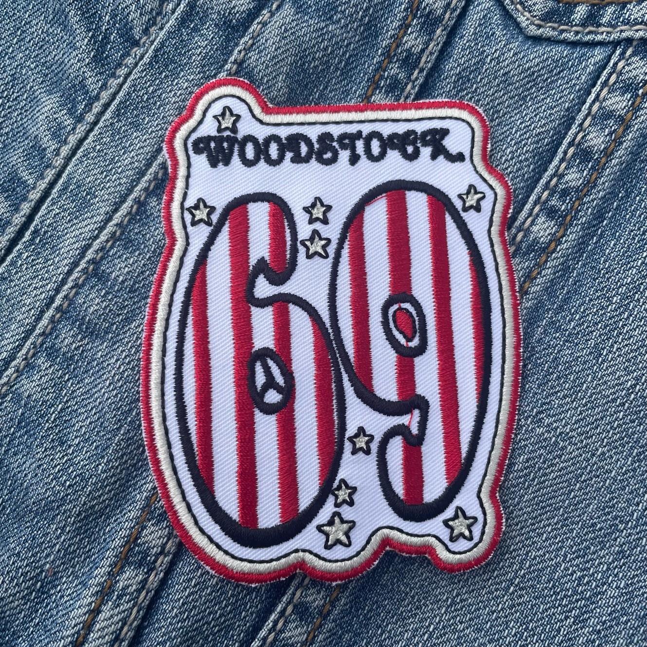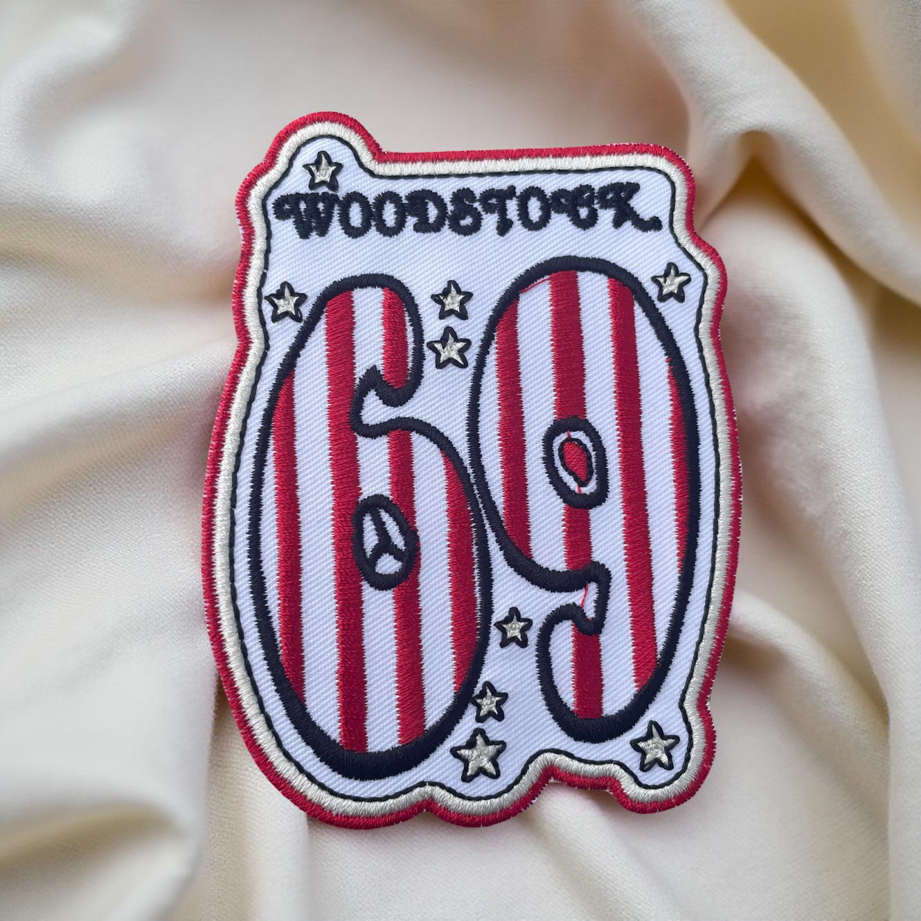 Design: Shaped patch with stylized “69” in red and white stripes, stars, and “Woodstock”-inspired text above